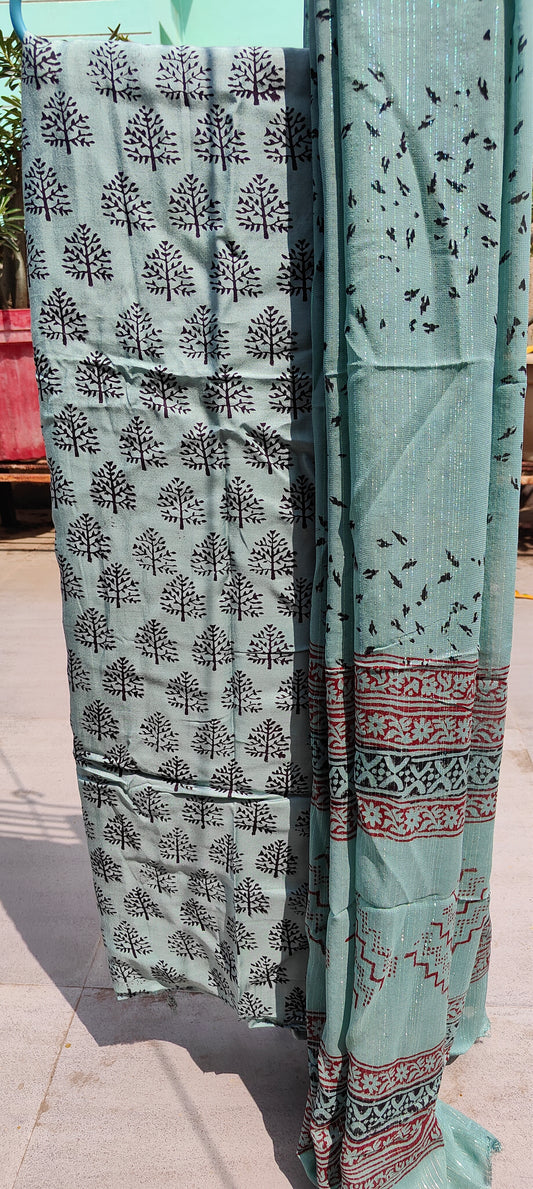 Bag Print Suit material with Chiffon Duppatta (Teal)