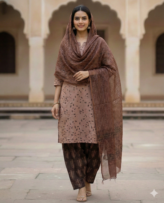 Bag Print Suit material with Chiffon Duppatta (Bronze)