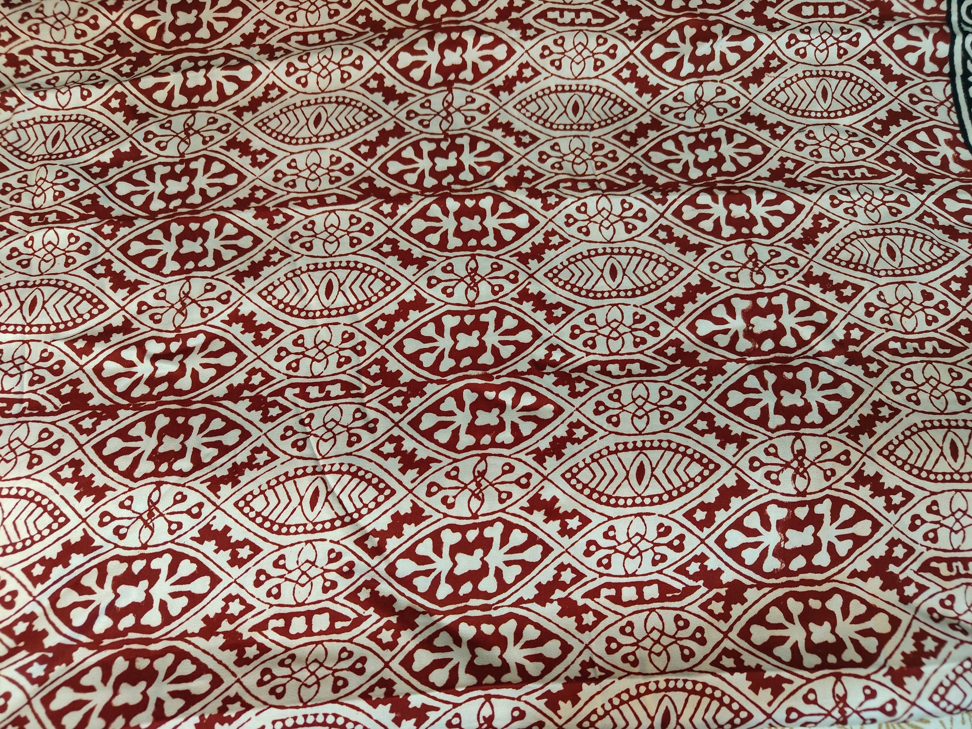 Artistry: Featuring intricate Ajrakh-inspired block prints. The body is adorned with classic floral and geometric motifs in a sophisticated palette of deep maroon, charcoal black, and ivory.