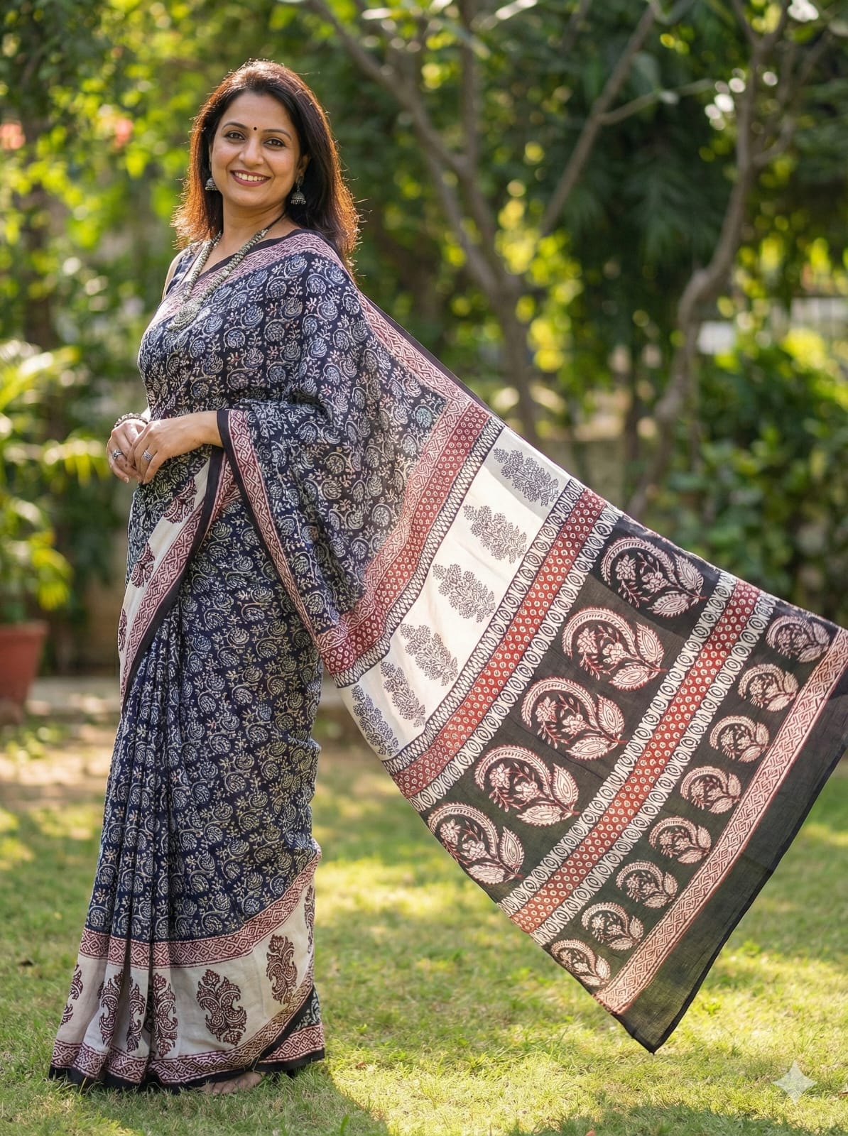 Originating from the Dhar district of Madhya Pradesh, each saree is a masterpiece of precision, dyed using traditional vegetable pigments and printed by hand with meticulously carved wooden blocks. The result is a stunning array of geometric patterns and floral motifs that carry the soul of Indian craftsmanship.