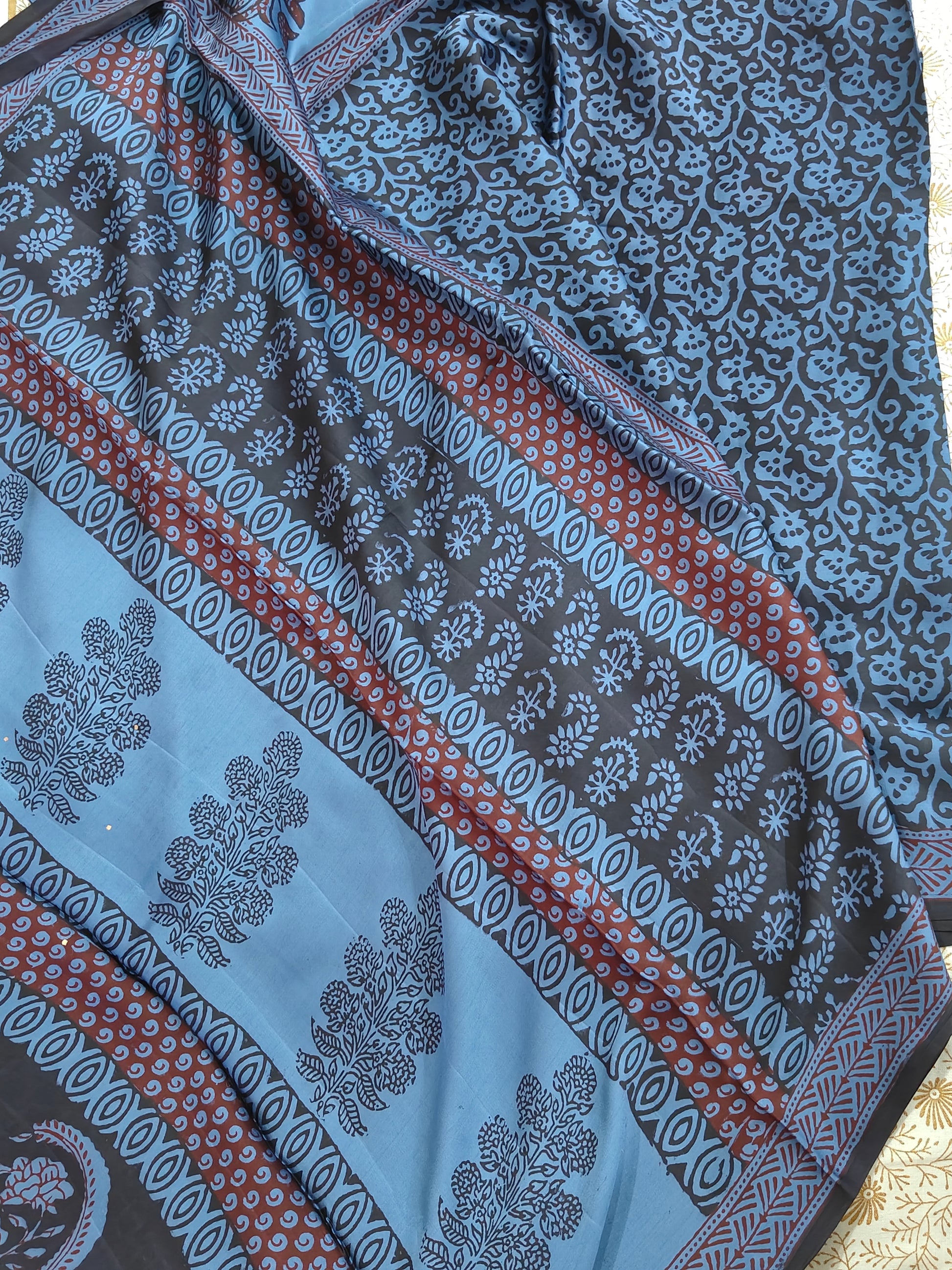 Handcrafted Uniqueness: No two sarees are identical. The subtle variations in the hand-block process are a testament to the artisan's touch.